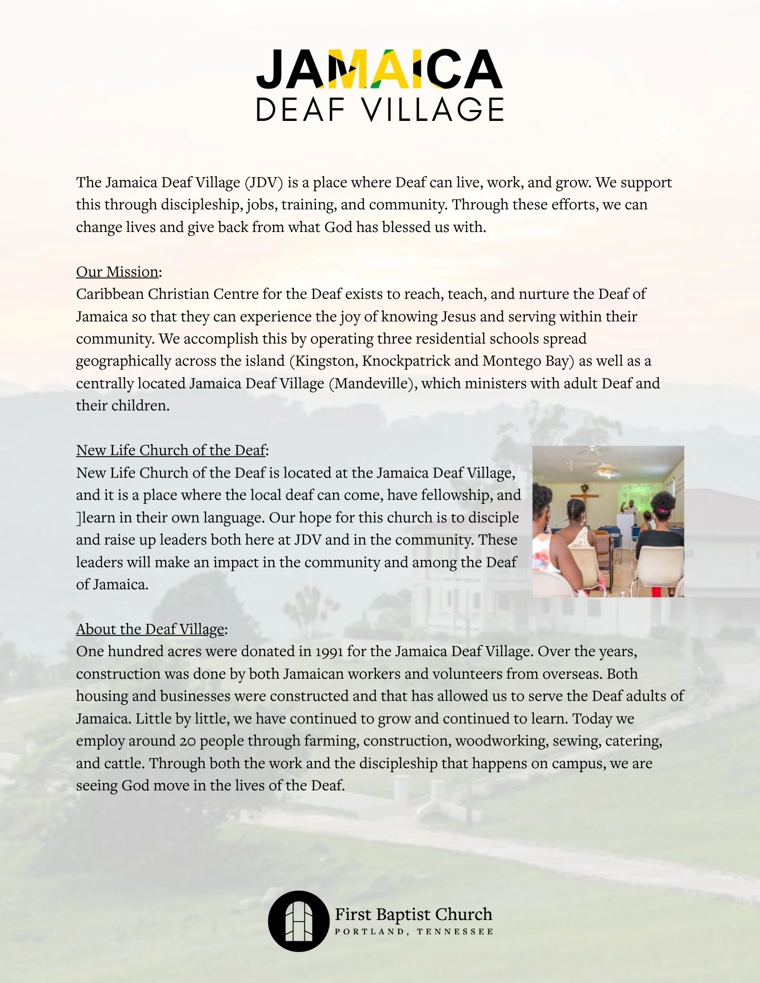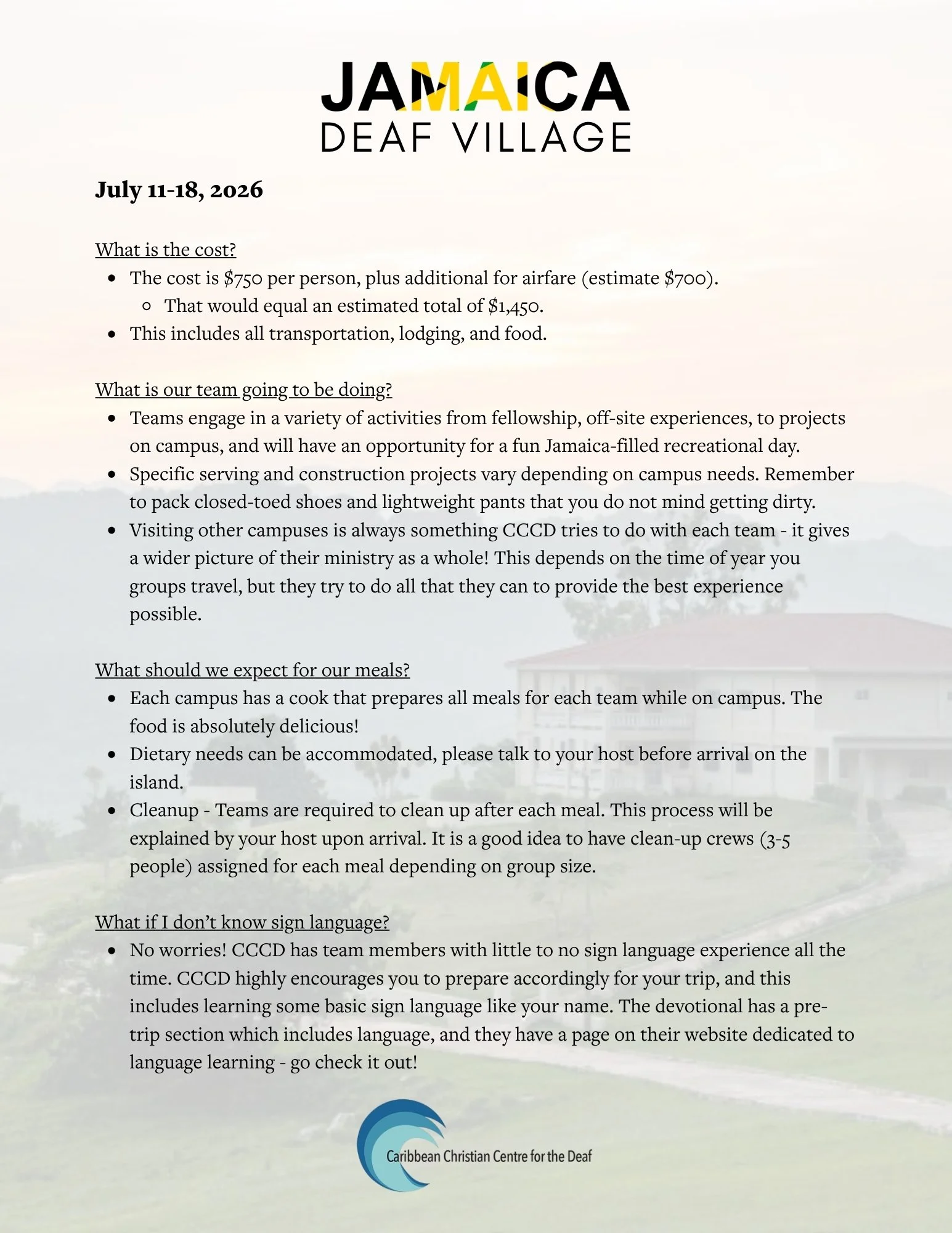 Below you will find information and registration for the Jamaica Deaf Village Mission trip as well as training resources and other facts as they arise.